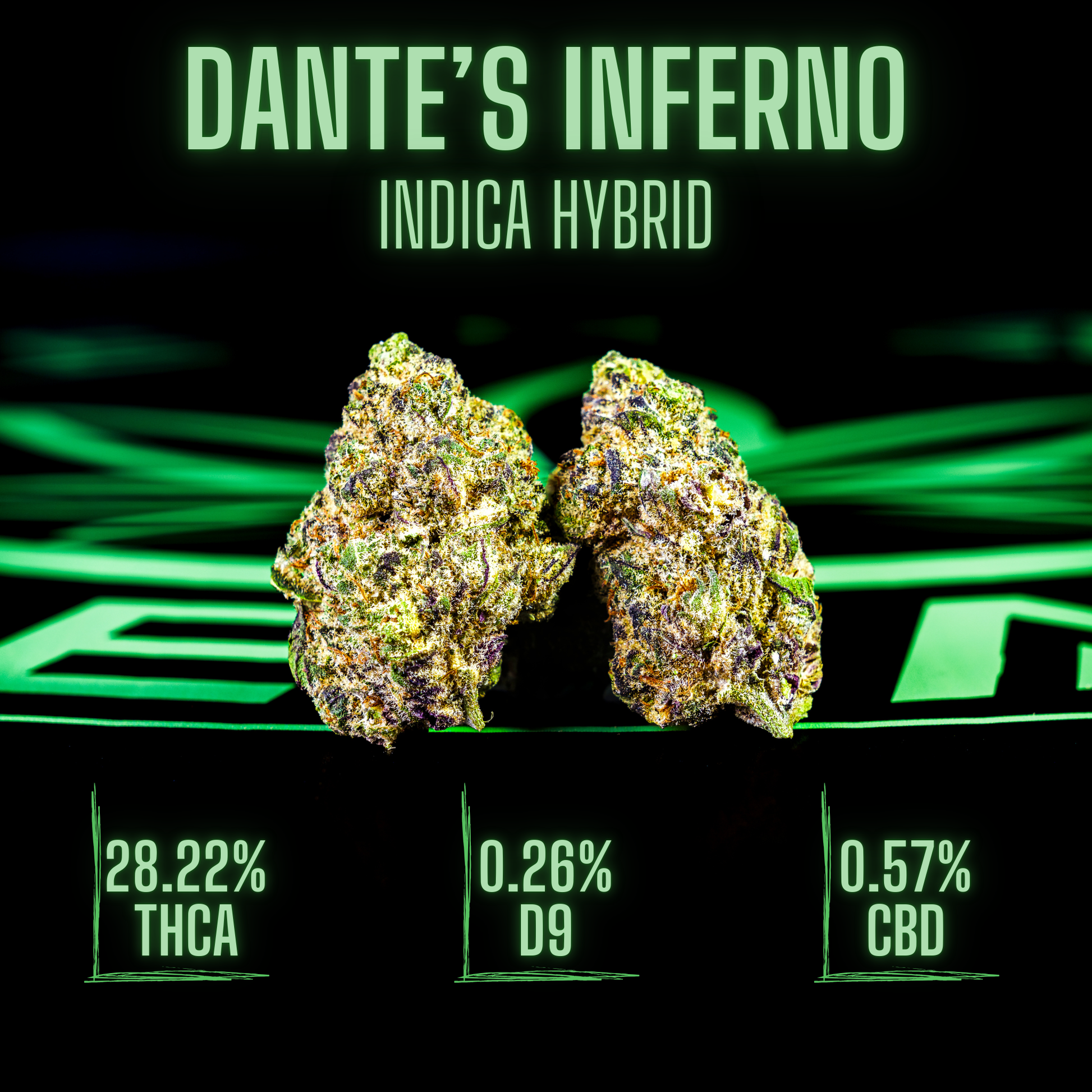 Experience an intense journey with Dante's Inferno Exotic THCA Flower. This powerful THCA strain, combines sweet and creamy aromas with a blingy appearance. With a stout 28.22% THCA content. This indica dominant hybrid with relaxing cookies genetics, is the perfect blend of adventure and relaxation.