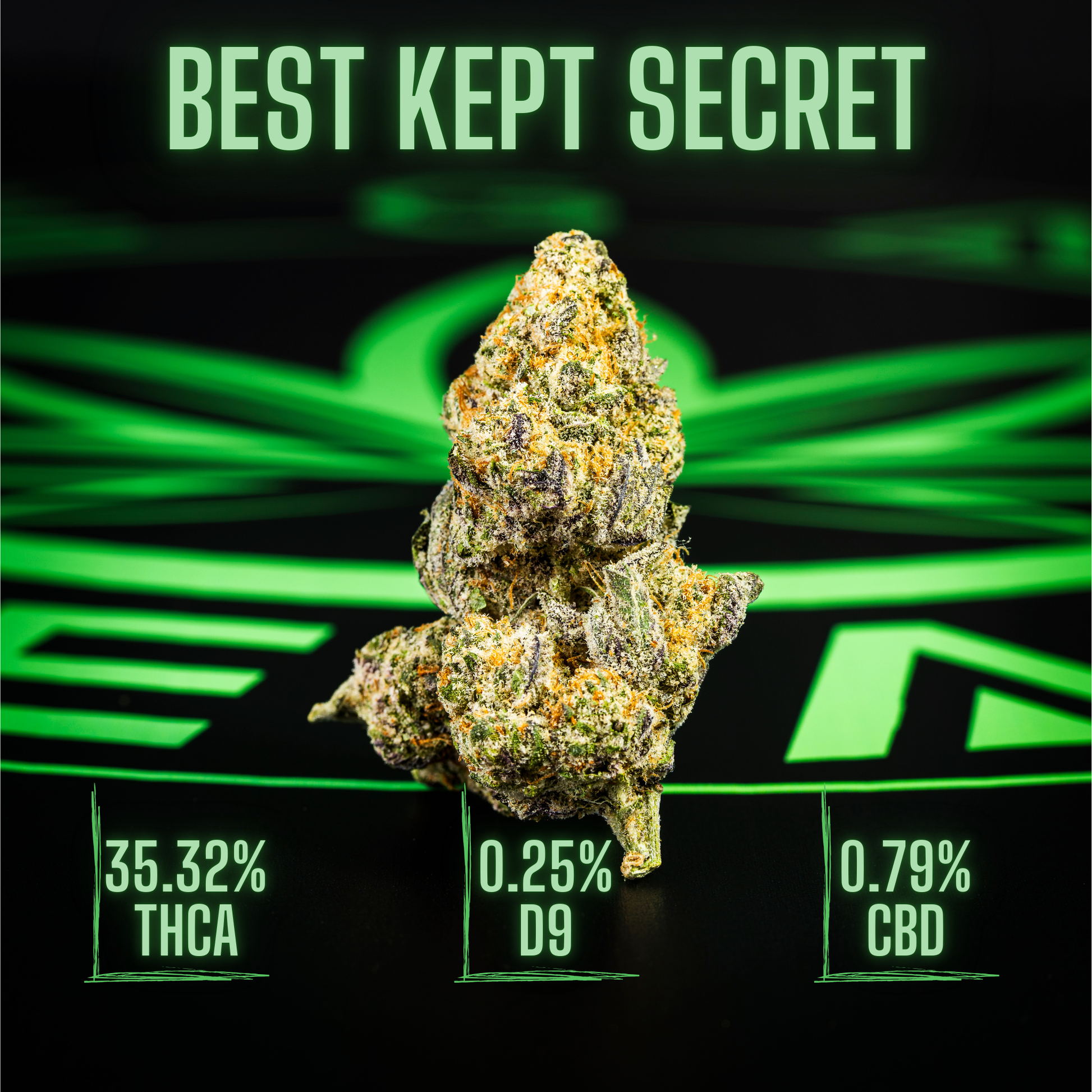 Unleash the secret with Legal Leaf's Exotic THCA Flower: Best Kept Secret. This well-balanced cross of Jealousy and Oreoz checks all the boxes with light green buds and frost-covered trichomes. A sweet and unique aroma adds appeal while providing serious stress relief at 35.32% THCA!