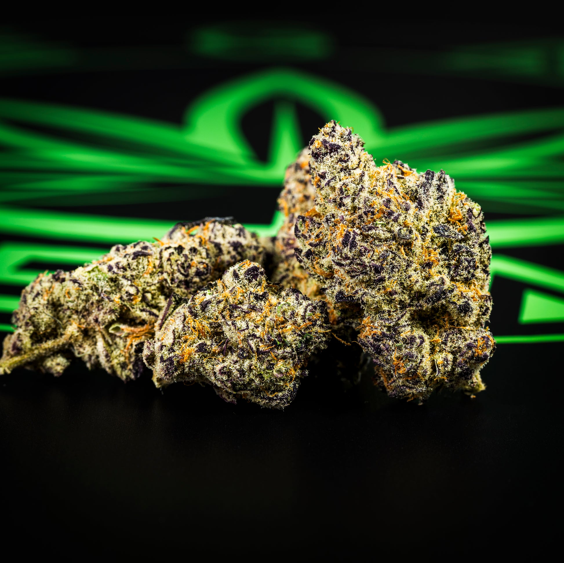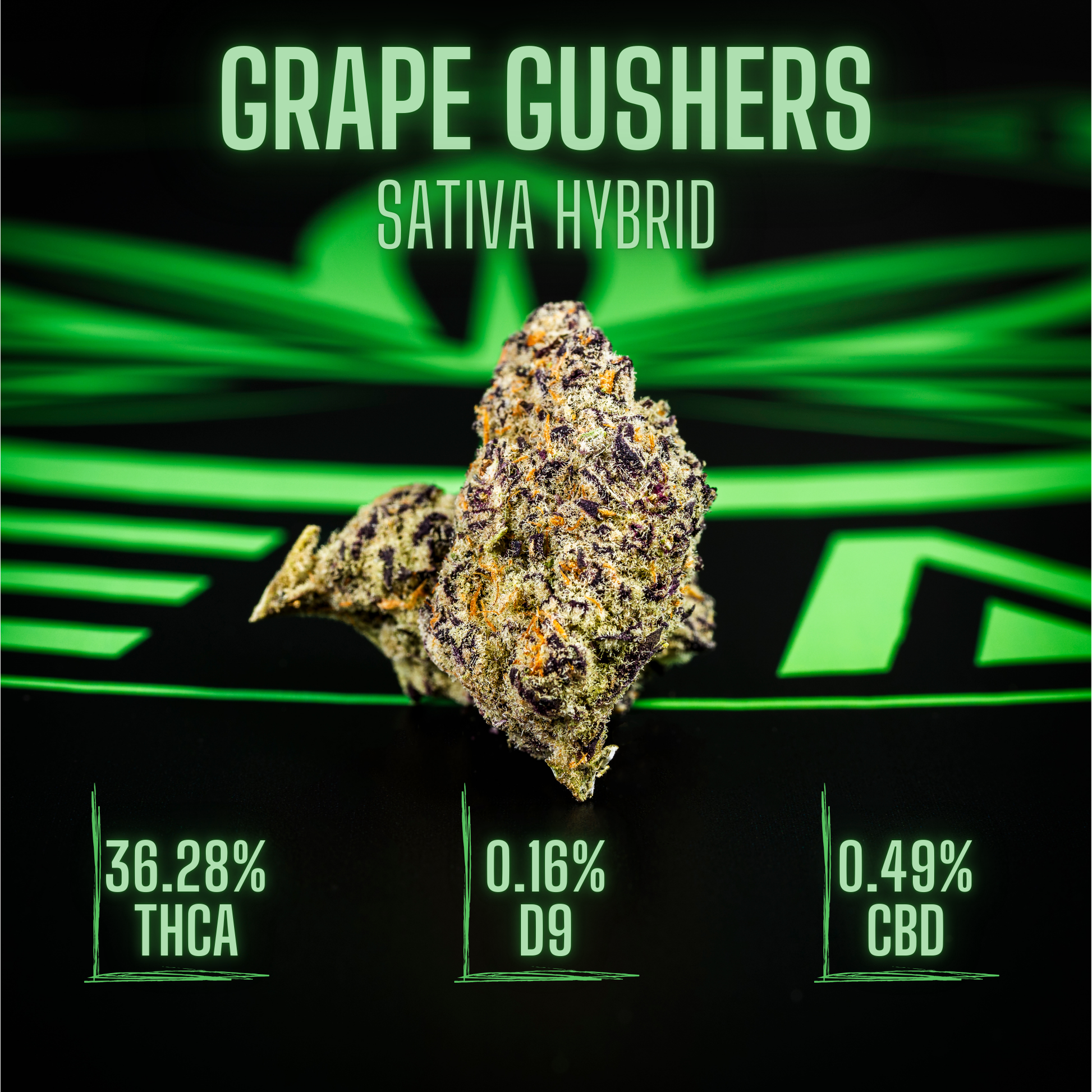 Introducing Legal Leaf Exotic THCA Flower: Grape Gushers. Get ready for a potent, euphoric experience with its strong grape aroma, creamy texture, and gassy berry notes. Its deep purple buds, coated in trichomes and highlighted with green and amber hairs, provide immediate relaxation. This Sativa Hybrid strain is, testing at an impressive 36%+ THCA.